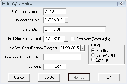 You may decide that you just want to delete the charges but still need a way to track it. Edit the charge under Edit Accounts and change the Description to Write Off or Bad Debt for example and click OK.
