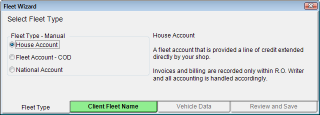 - Select the type of fleet account: House Account or Fleet Account - COD. The Client Fleet Name tab activates and turns green because it is the next step.