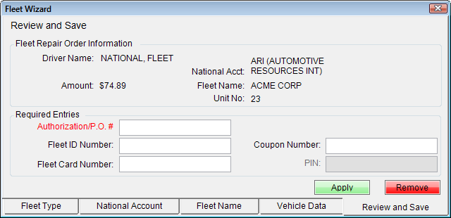 - Enter the required information: Authorization/P.O. #, Fleet ID Number, Fleet Card Number, or Coupon Number.