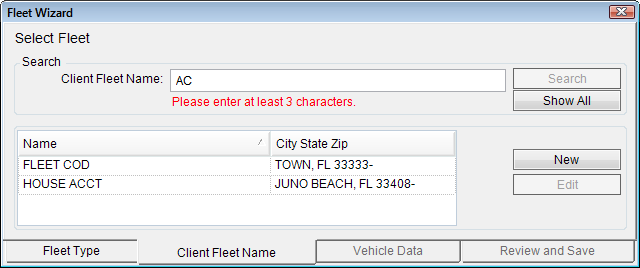 - Type in at least three characters in the Client Fleet Name field and click the Search button.