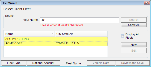 You search for and select the client fleets of the selected national account on the Fleet Name tab. The client fleet accounts of the selected national account are highlighted in yellow.