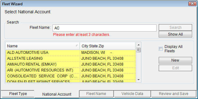 - Click the Show All button to clear the search results and repopulate the list with all national accounts in the system. (If the Display All Fleets option is selected, clicking Show All returns all fleet account types.)