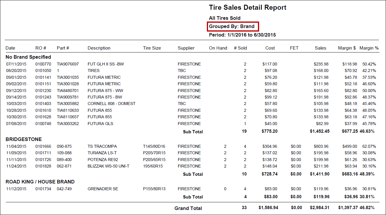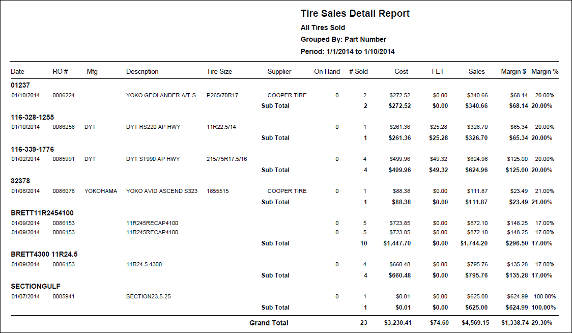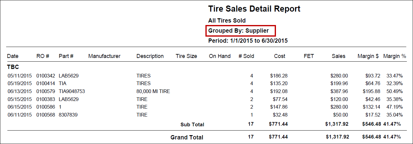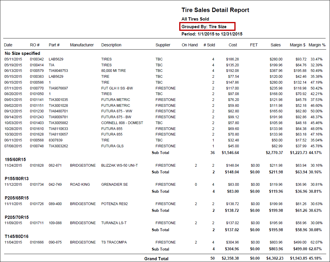 - Includes more detailed information about each tire sale than the summary, including the repair order number, tire size, and supplier.