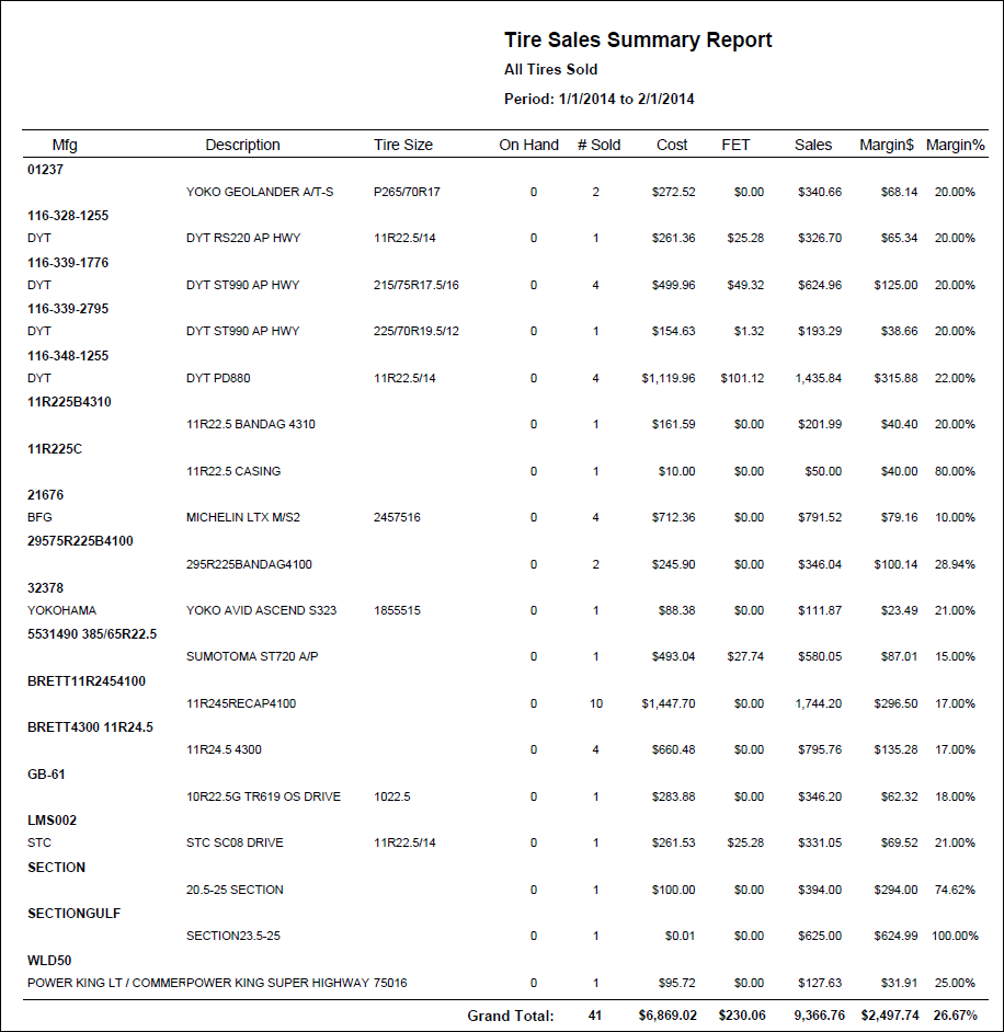 This report is a summary of all tires sold from your inventory - both Stock and Non-Stock tires from all suppliers.