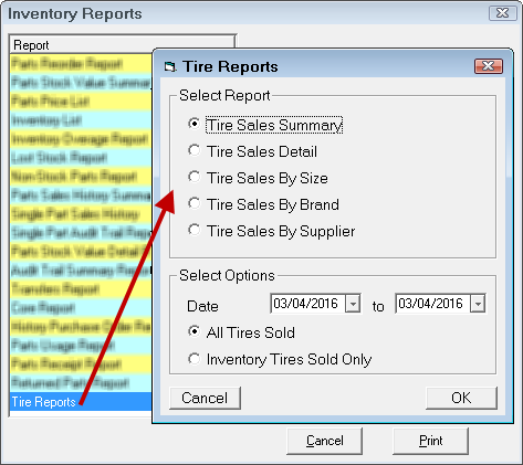 . On the Inventory Reports window, double-click Tire Reports at the bottom of the list.