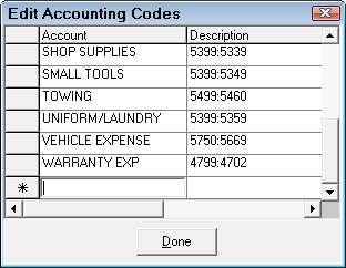 These accounts are for credit cards that the facility may use to pay for purchased items. It is recommended that the credit card name and account name be something different from the account names established under Repair Order Payment Types. One way might be to add the last 4 digits of the credit card number.