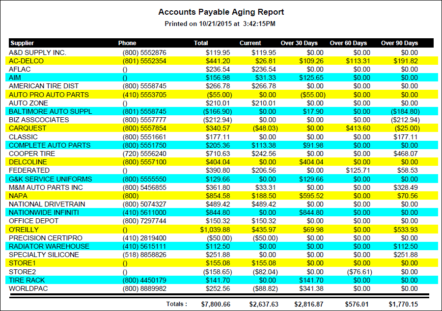 The Payable Aging report displays a list of suppliers that you owe money to. It lists their phone number, the total amount you owe them, the amount that is current, over 30 days, over 60 days, and over 90 days.