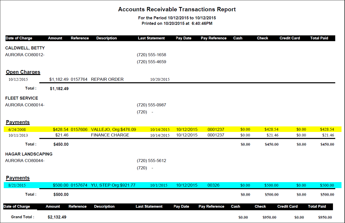 The information included is the date of charge, amount, reference, usually the repair order number, description, last statement date, payment date, payment reference such as check number, the amount paid in cash, check or credit card, and the total amount paid.