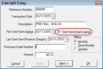 It is important to understand how accounts are aged in R.O. Writer so that the Accounts Receivable process works the way you, the user, intends. When a charge is made to accounts receivable from a repair order, the date the repair order is closed is entered as the transaction date, the first statement sent date, and the last statement sent date. When the first statement is sent, the date is entered in the First Stmt Sent (Aging) field, and a check mark is entered in the Stmt Sent field. This will begin the aging process for the charge. The age of the account is based on the date of the first statement or the date of the transaction, depending on the selection in Setup.
