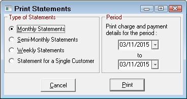 Select the type of statement to print, and select the date range to include transactions. Only the customers that are set up for the type of billing selected will be printed, and only the transactions that occurred during the time period selected will appear on the statements. All other transactions, charges or payments, will be shown as balance forward.