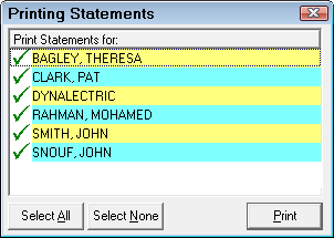 To print the accounts receivable statements, select the appropriate printer, and press the Print button. The customer information is merged with the letter and printed, and the files are updated. Printing the statements begins the account aging process.