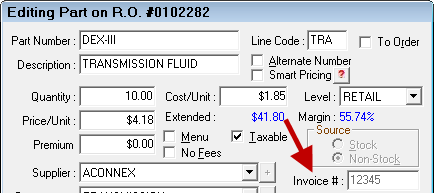 This is the invoice number from the supplier of the part. This field is used if