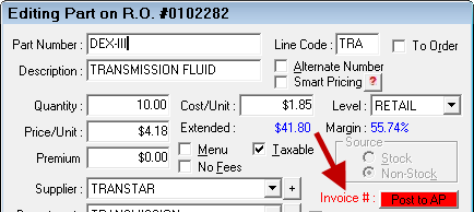 NOTE: Once the Post Accounts Payable Invoice window opens, you will no have no access to the Edit Parts window. Therefore, make a note of the supplier and part before clicking the Post to AP button.