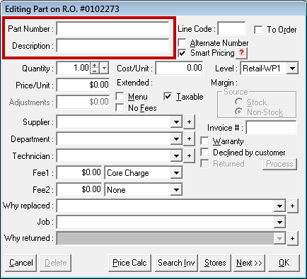 If you need to add a part on the fly, you can add the part just to the current estimate or repair order by entering its information on the Edit Parts window. Only use this option if do not need to track the part's usage.