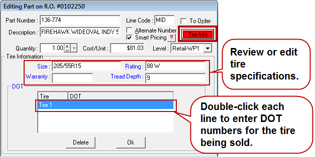 The button is red when DOT information is required for each tire. You cannot finalize the repair order until the DOT numbers are entered. Tire information prints on estimates, work orders, and repair orders automatically.