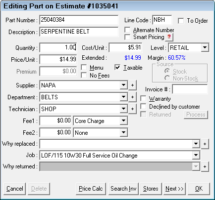 - Displays the part information and enables you to edit it for the estimate or repair order.