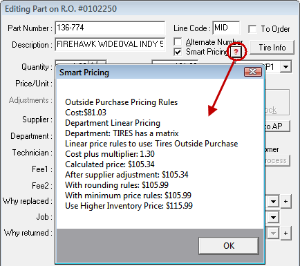 After all the details are entered, click OK. These changes apply only to the part on the current estimate or repair order.