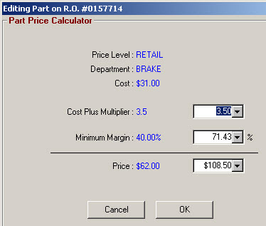 If the cost, or the shop’s cost for a part is entered, the parts price calculator will compute what needs to be charged for this part in order to make the minimum profit margin. The profit margin, the multiplier, or the price per unit may be changed, and the other two fields are adjusted accordingly.