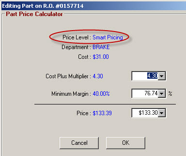 Also displayed by the calculator is the unit cost of the part, the price level, the parts department, the cost multiplier for the selected department, and the minimum margin. If the price is adjusted below the minimum margin, a warning message is displayed.