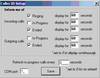 - Incoming and Outgoing calls - You can have the system alert you for calls when the phone rings, for calls that are in progress, and when the call was ended. Enter the number of seconds to display or enter 0 seconds to display continuously.