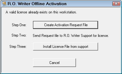 Offline activation is used for computers that do not have a connection to the internet. R.O. Writer sends you the license file and you need to save it to the location required by R.O. Writer.