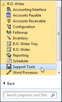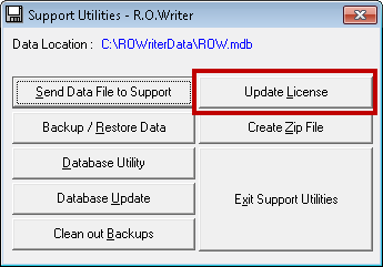 - Click the Start button (in Windows 7) > All Programs > R.O. Writer > Support Tools > Update License button.