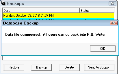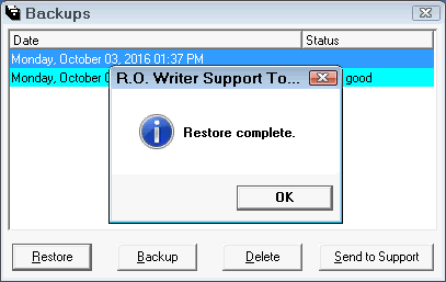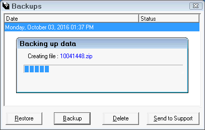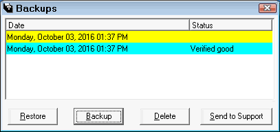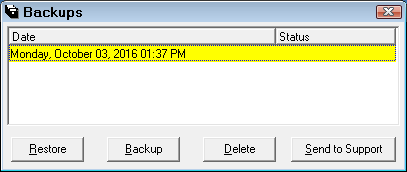 All backups performed through end of day or from here will display and show the data and time and the status. You can select the backup you wish to restore, delete, or send to support. For more backup tips, see Backup Tips.