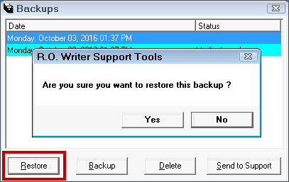 - Click Yes. R.O. Writer starts restoring the database.