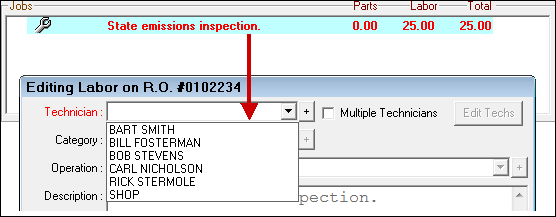 - In the Technician dropdown list, double-click on each technician you want to assign to the job. (Each technician will have a sub-labor row on the master labor operation).