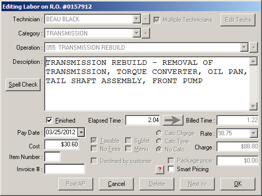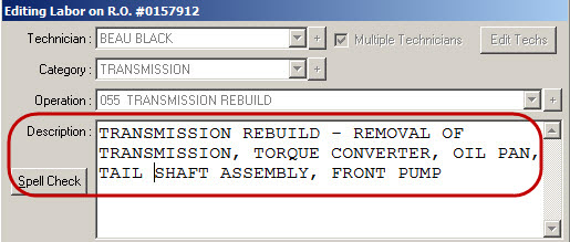 NOTE: After a technician is assigned, he or she needs to start and stop the Labor Time Clock to track their time on the job. The Labor Time Clock is started and stopped by selecting the labor operation and pressing the letter "t" on the keyboard.