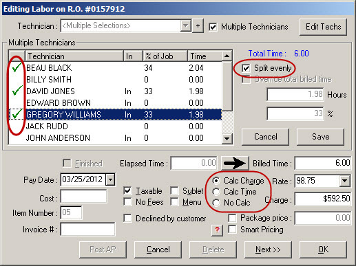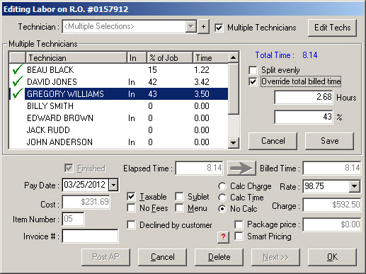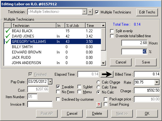 When you open each sub-labor operation, you see the time and charge for each technician in the time and charge areas.
