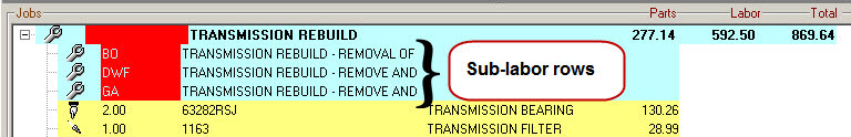 When multiple technicians are assigned to one job, the labor is split into the main row for the labor operation and a sub-row for each technician; the "sub labor" rows.