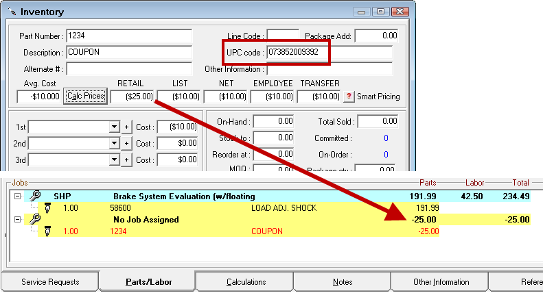Your shop may want to offer discounts and coupons from time to time. In R.O. Writer, you can do that by creating a part with a negative average cost and associating that part with a bar code. Then, you can add the coupon part to the ticket just by scanning the coupon's bar code while the ticket is open to the Parts/Labor Tab.
