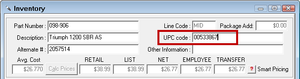 - Scan the bar code of the part and the UPC code is entered into the UPC code field.
