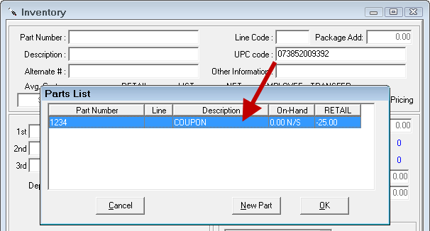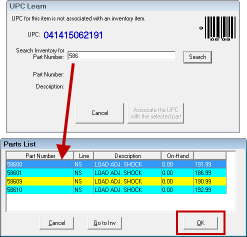- Press ENTER. The Parts List appears with the matching parts. (You can add the same UPC code to multiple parts.)