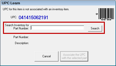 If you scan a part that has no UPC code in Inventory, R.O. Writer reads the UPC code and allows you to search your inventory for a part you can associate it with. The associated part is added to the ticket immediately.