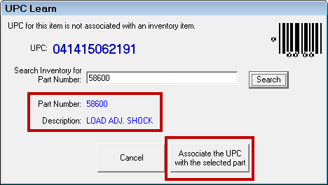 - The UPC code is associated with the part (it's added to the UPC Code field). The part is added to the ticket.