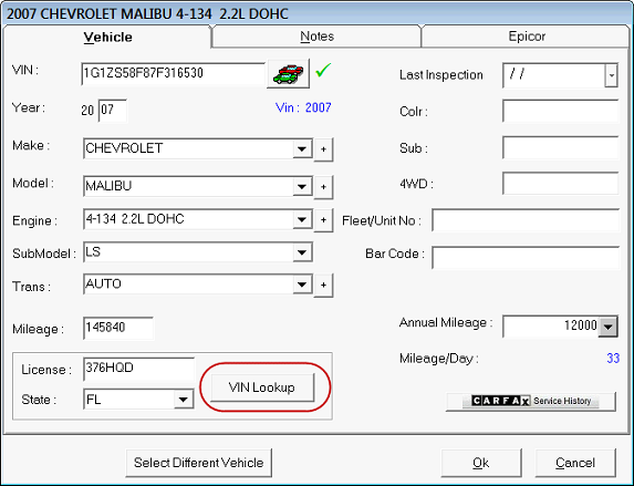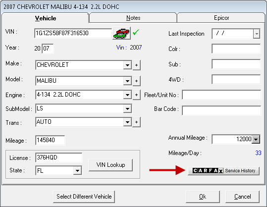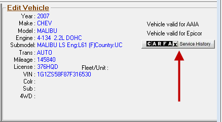 NOTE: If you notice a difference between the vehicle information on the popup window and the vehicle information entered into the Edit Vehicle fields, this does not mean something is wrong necessarily. Differences occur because there are differences between the CARFAX and Epicor databases.