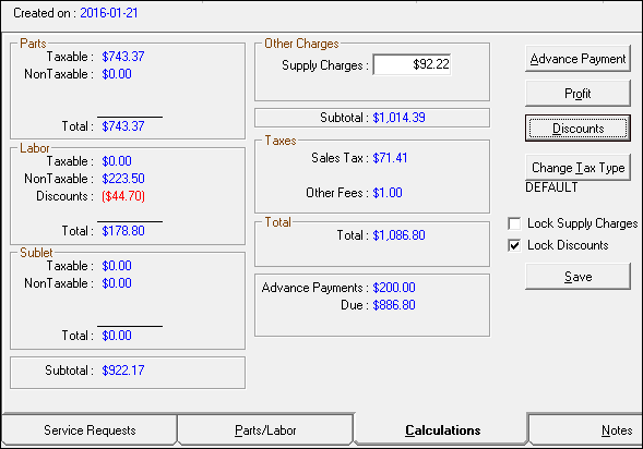 After you click the OK button, the Lock Discounts box is checked and the amount of the discount will not recalculate even if you add more parts and labor. If you wish to recalculate the discount, uncheck the Lock Discounts box, select Save, and re-select the discounts.