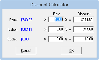 There may be times that a shop wishes to discount a repair order. Either the percentage discount is entered, and the absolute dollar amount is calculated, or the absolute dollar amount may be input, and the percentage rate calculated.