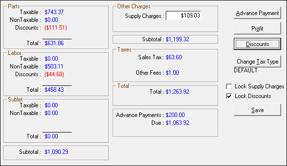 Discounts will appear in red and be discounted in the Parts, Labor, and Sublet totals. Package discounts also appear here when using the new package pricing options.