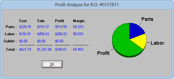 The profit analysis shows the details of how much gross profit is being made on the current repair order. The summary of parts, labor, and any sublets are shown with how much each cost, the amount of the sale, the profit, and the profit margin. This does not include any supply charges or sales taxes.