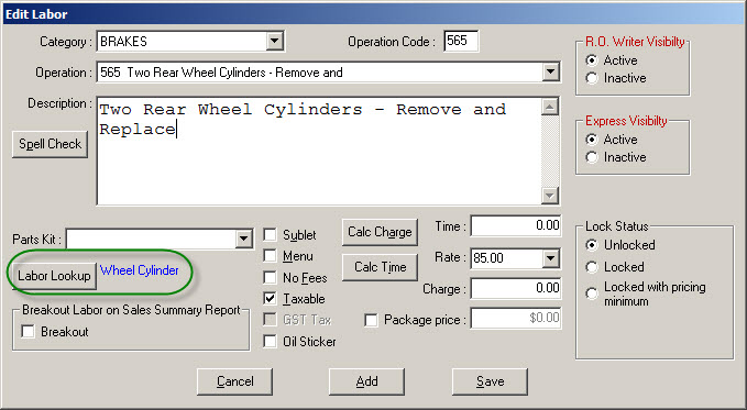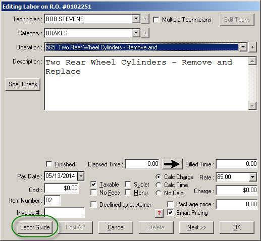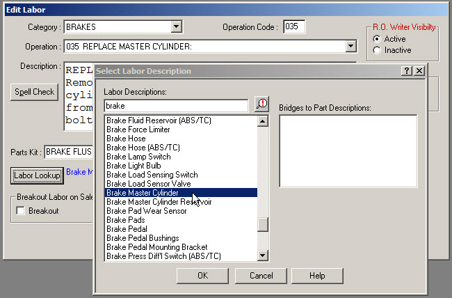 You can add items from the Epicor Labor Guide to R.O. Writer Labor Operations. This permits each labor operation to be modified based on the standard labor time from the catalog for a particular vehicle.
