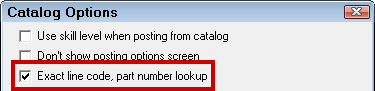 In Configuration, open Repair Order Catalog Options (Configuration menu > Repair Order > Catalog Options) and check Exact Line Code, Part Number Lookup.