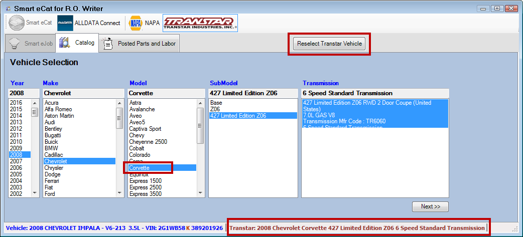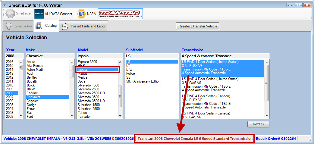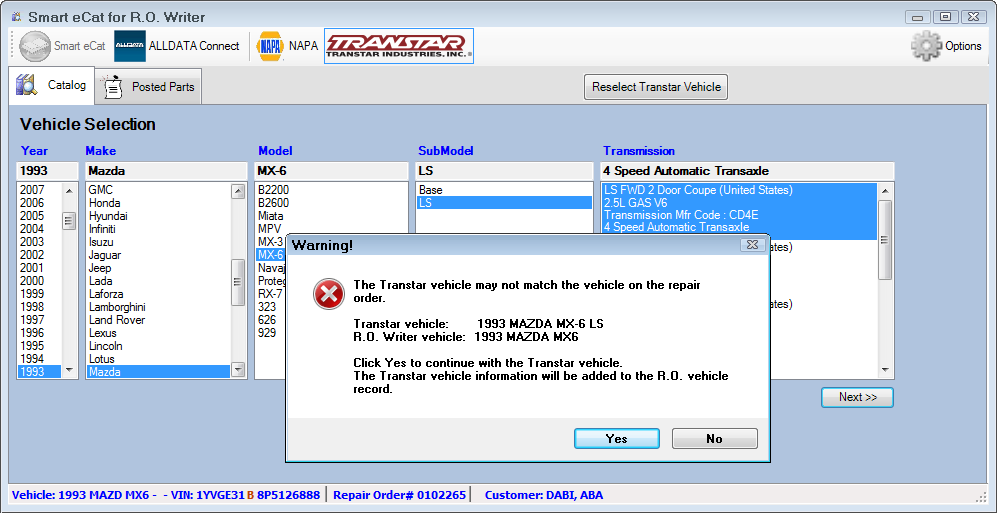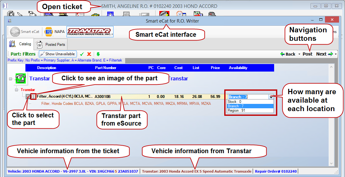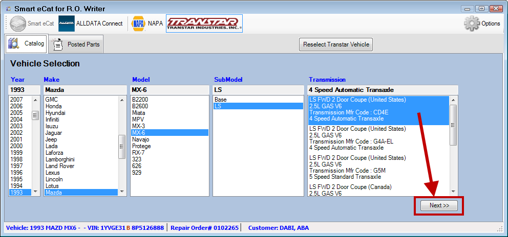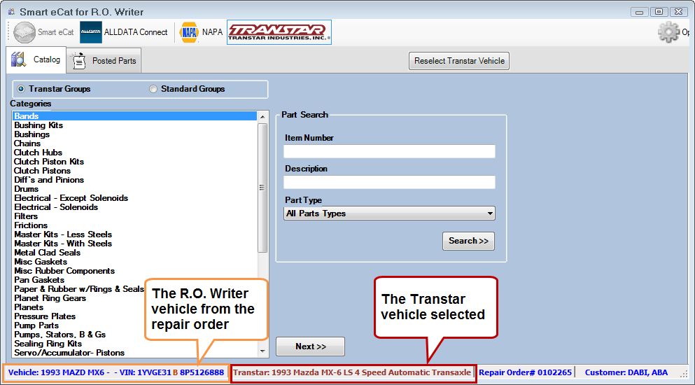 - R.O. Writer connects to the Transtar eSource catalog and searches for the vehicle in the open ticket.