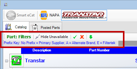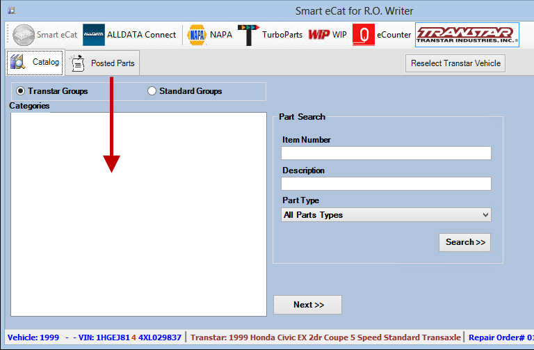 NOTE: If you access Transtar when no estimate or repair order is open, you can search the Transtar eSource catalog but cannot post parts to a ticket.