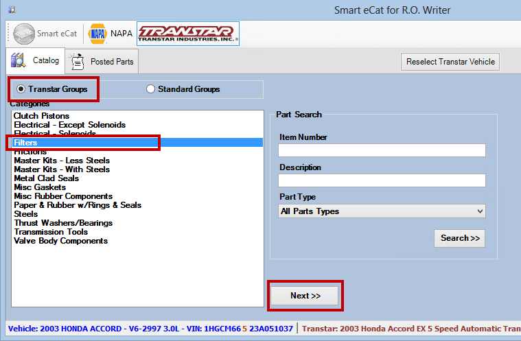 Then, click Next and the parts selection window opens showing the categories for the Transtar vehicle.