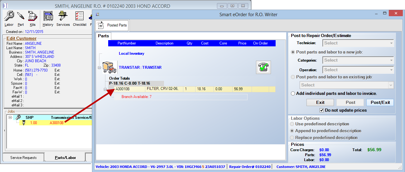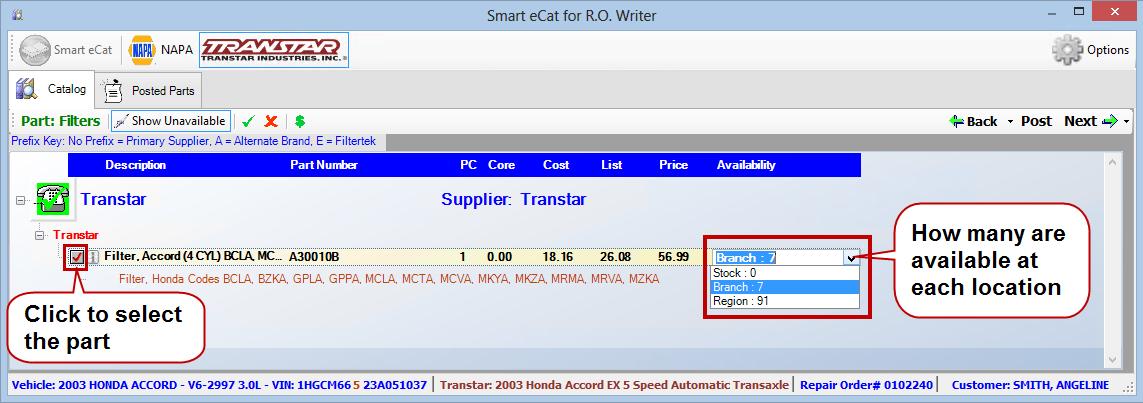 - R.O. Writer searches your local inventory by part number/line code combination.