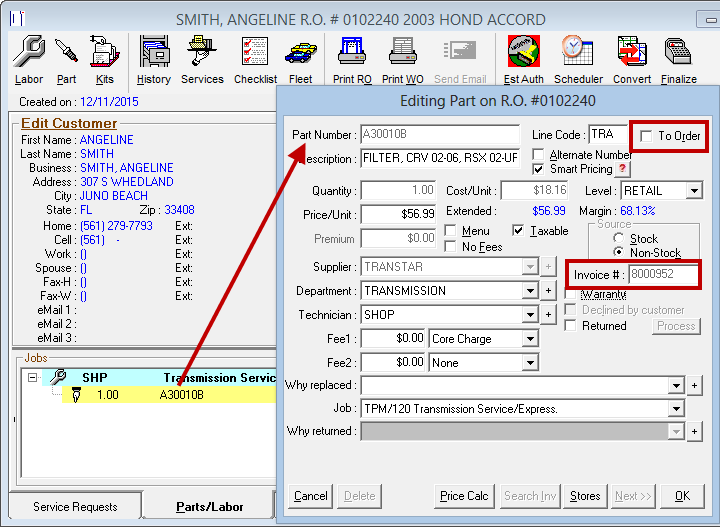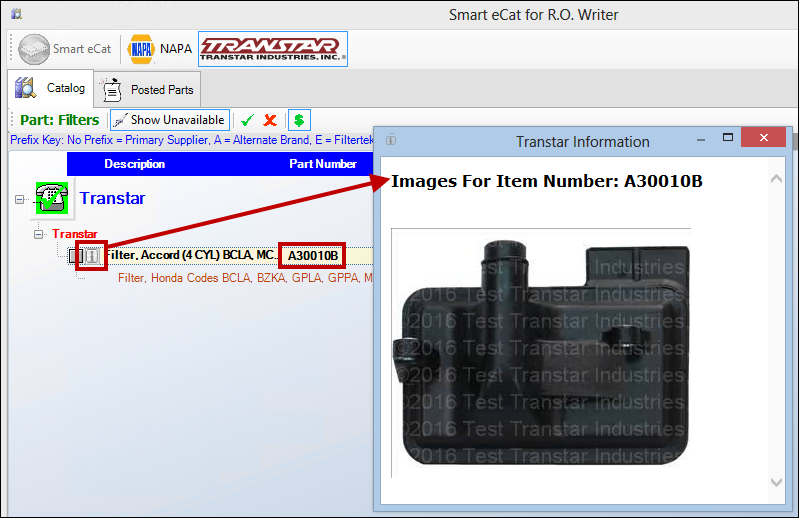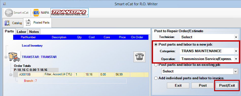 Keep in mind the following when ordering Transtar parts in R.O. Writer: