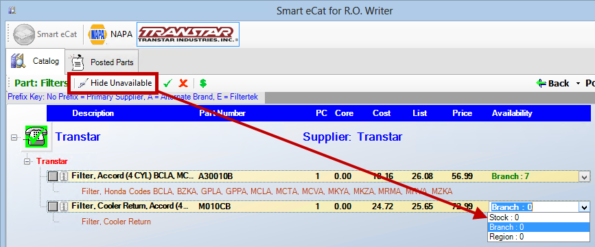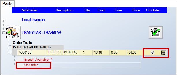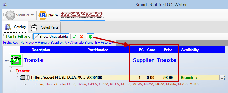 R.O. Writer returns Transtar parts in your local inventory as part of a search only if the part number/line code combination match. However, because Transtar does not use line codes, line codes are never sent to Transtar when ordering parts.